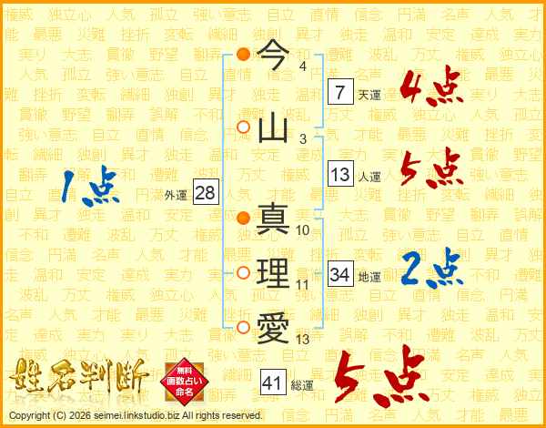 今(4画)山(3画) 真(10画)理(11画)愛(13画)