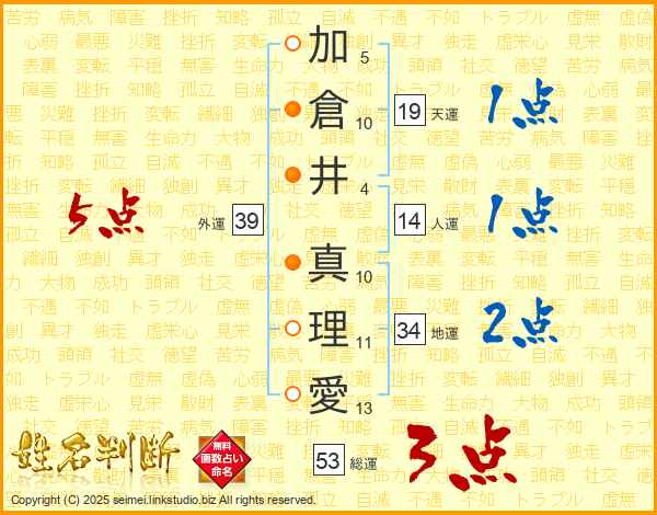 加(5画)倉(10画)井(4画) 真(10画)理(11画)愛(13画)
