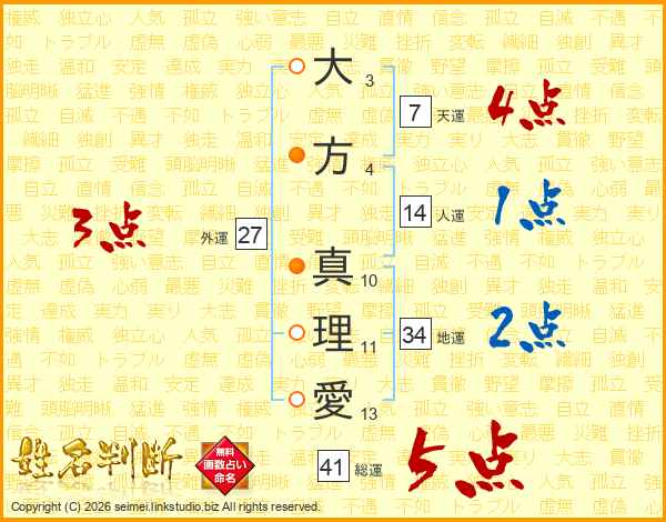 大方真理愛さんの総運は41画の5点!