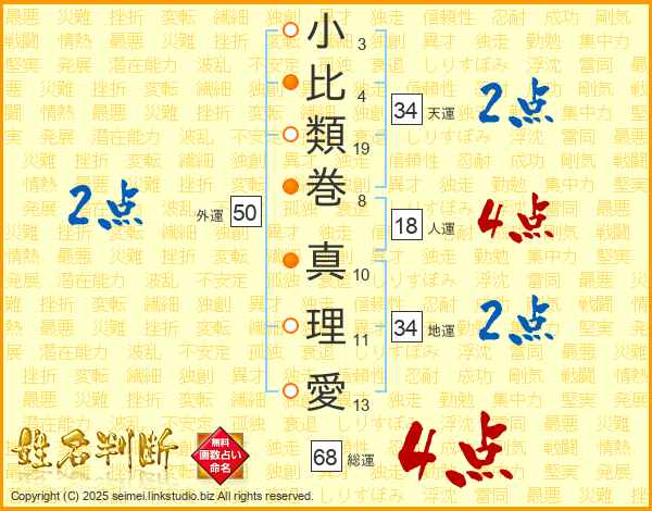 小(3画)比(4画)類(19画)巻(8画) 真(10画)理(11画)愛(13画)