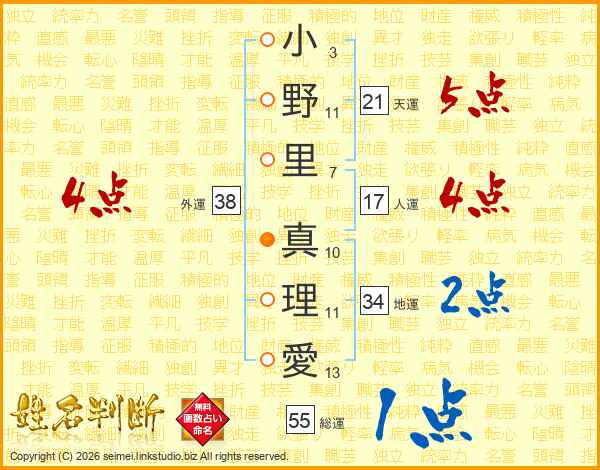小(3画)野(11画)里(7画) 真(10画)理(11画)愛(13画)