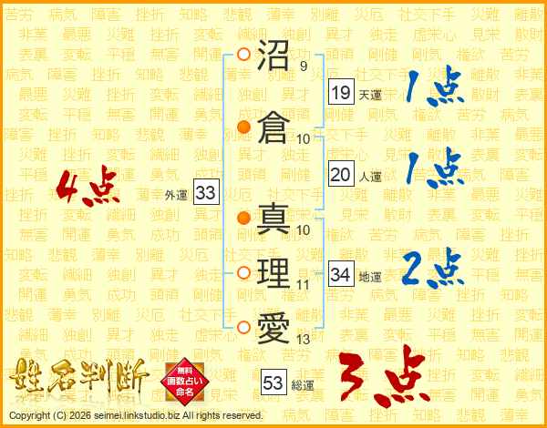 沼(9画)倉(10画) 真(10画)理(11画)愛(13画)