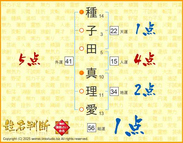種(14画)子(3画)田(5画) 真(10画)理(11画)愛(13画)