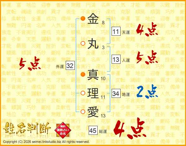 金(8画)丸(3画) 真(10画)理(11画)愛(13画)