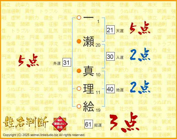 一(1画)瀬(20画) 真(10画)理(11画)絵(19画)