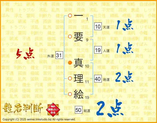 一(1画)要(9画) 真(10画)理(11画)絵(19画)