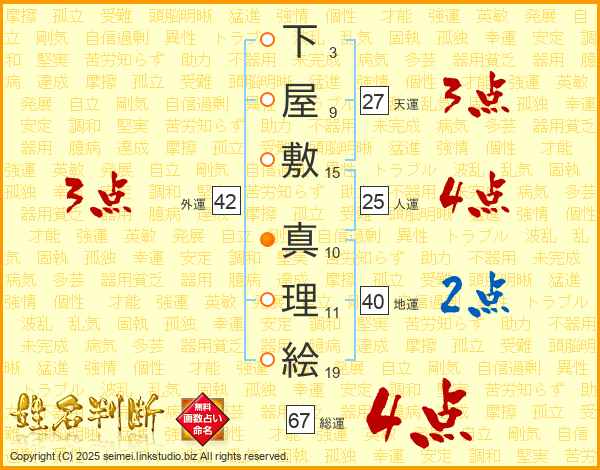 下(3画)屋(9画)敷(15画) 真(10画)理(11画)絵(19画)
