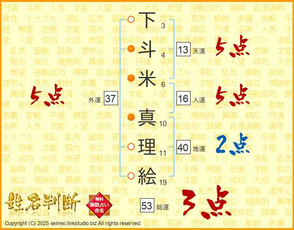 下(3画)斗(4画)米(6画) 真(10画)理(11画)絵(19画)