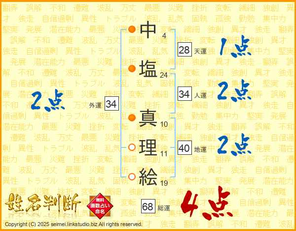 中(4画)塩(24画) 真(10画)理(11画)絵(19画)
