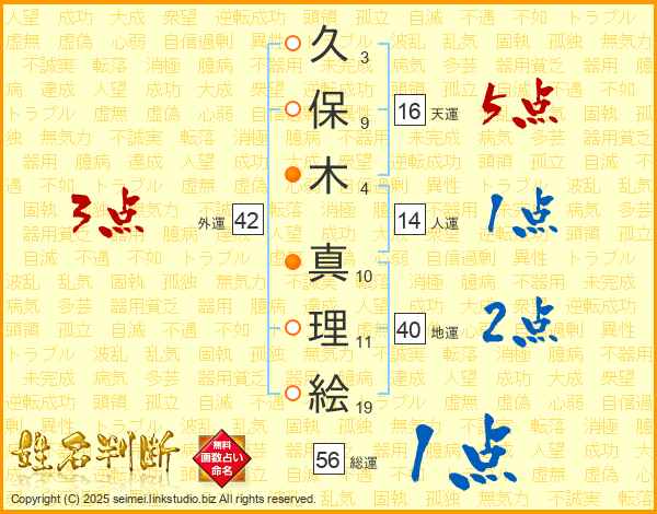 久(3画)保(9画)木(4画) 真(10画)理(11画)絵(19画)