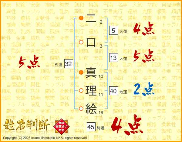 生活面を象徴する運勢です。外部から受ける影響力を表し、結婚運、家庭運や職場、環境への順応性を表します。総運から人運を引いた画数。姓や名が1文字の場合を除く。