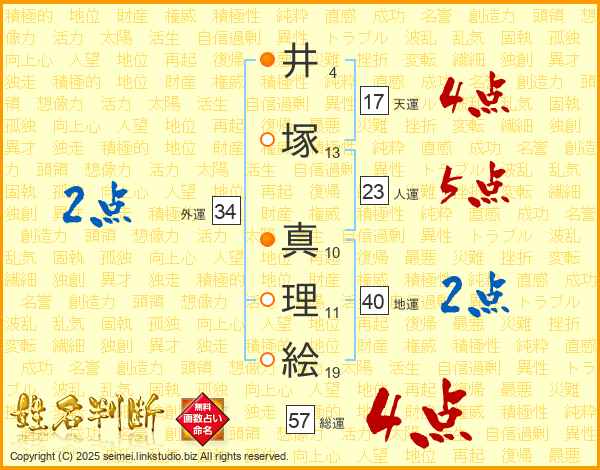 井(4画)塚(13画) 真(10画)理(11画)絵(19画)