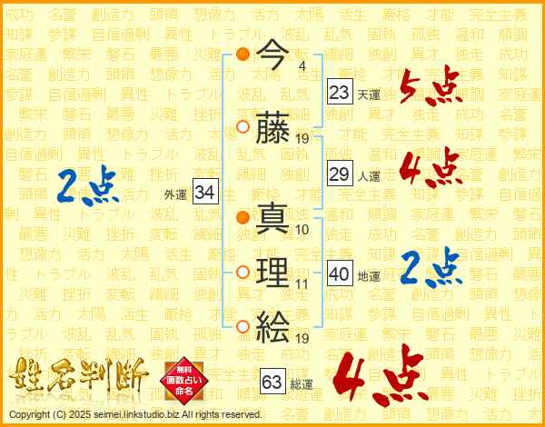 今(4画)藤(19画) 真(10画)理(11画)絵(19画)