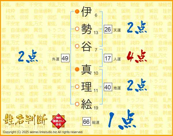 伊(6画)勢(13画)谷(7画) 真(10画)理(11画)絵(19画)