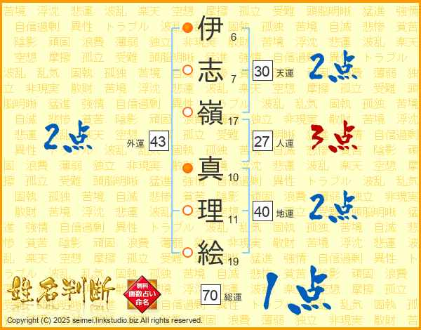 伊(6画)志(7画)嶺(17画) 真(10画)理(11画)絵(19画)