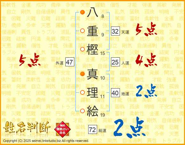 八(8画)重(9画)樫(15画) 真(10画)理(11画)絵(19画)