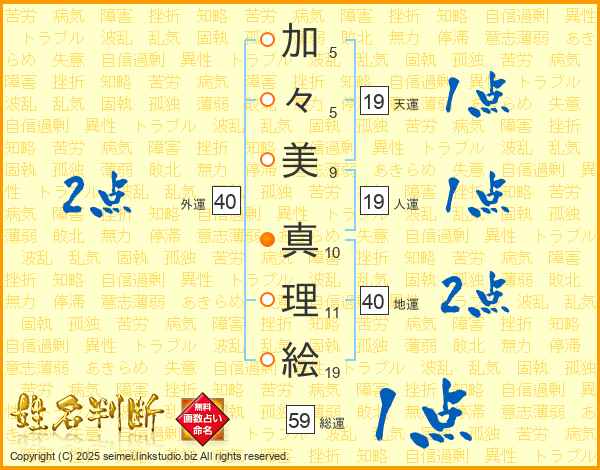 加(5画)々(5画)美(9画) 真(10画)理(11画)絵(19画)