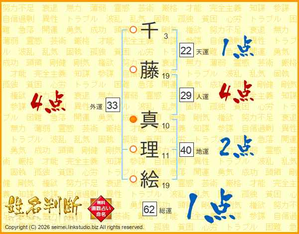 千(3画)藤(19画) 真(10画)理(11画)絵(19画)