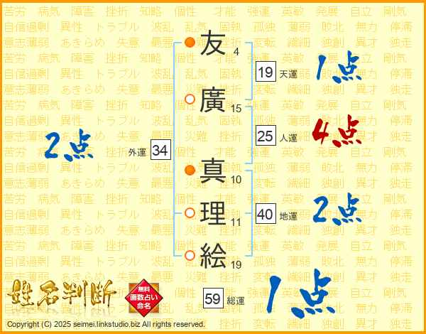 友(4画)廣(15画) 真(10画)理(11画)絵(19画)