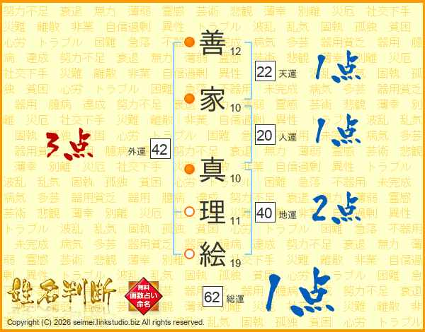 善(12画)家(10画) 真(10画)理(11画)絵(19画)