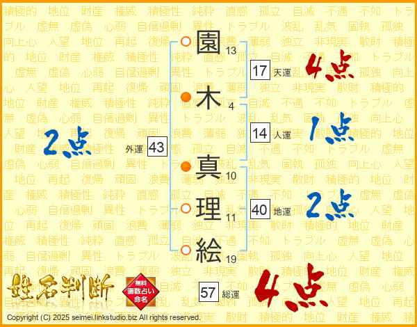 園(13画)木(4画) 真(10画)理(11画)絵(19画)