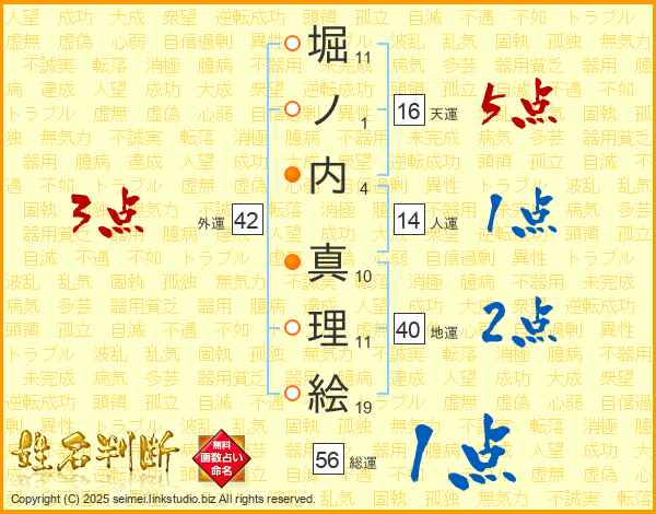 堀(11画)ノ(1画)内(4画) 真(10画)理(11画)絵(19画)