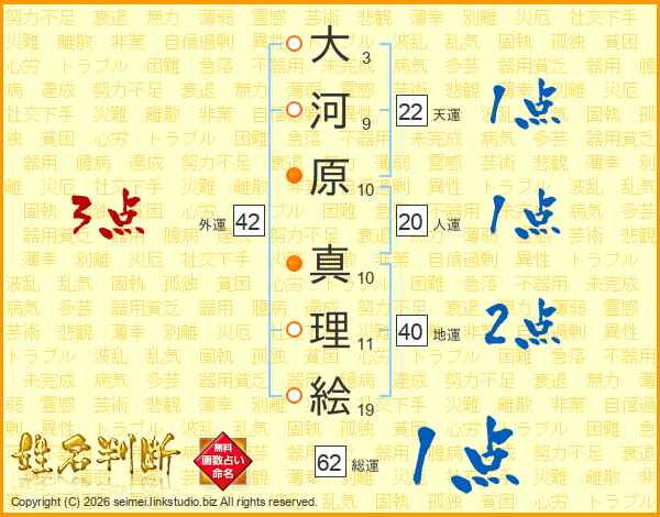 大(3画)河(9画)原(10画) 真(10画)理(11画)絵(19画)