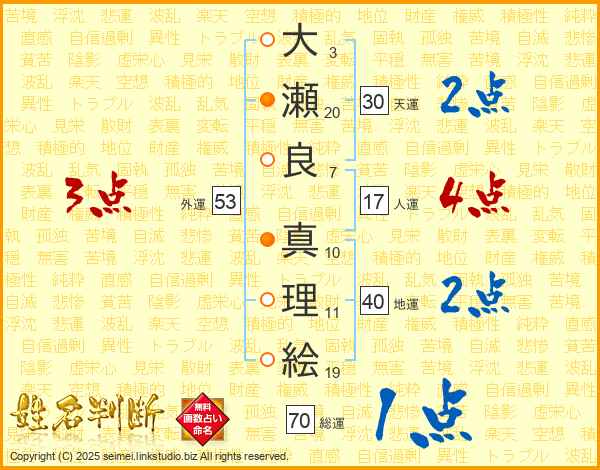 大(3画)瀬(20画)良(7画) 真(10画)理(11画)絵(19画)