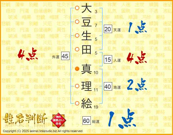 大(3画)豆(7画)生(5画)田(5画) 真(10画)理(11画)絵(19画)