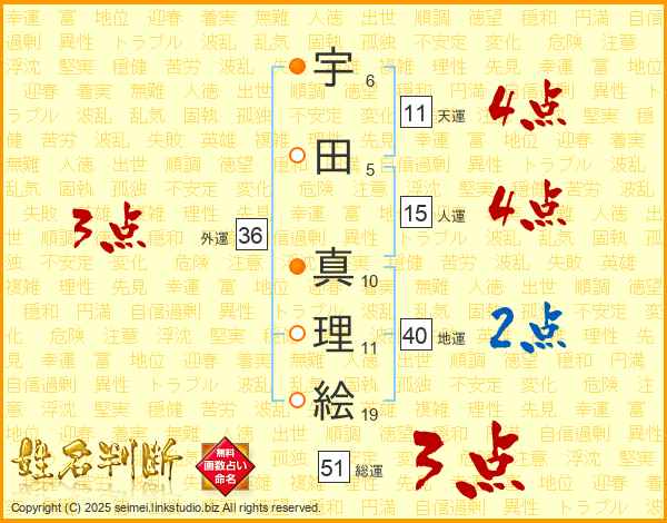 宇(6画)田(5画) 真(10画)理(11画)絵(19画)
