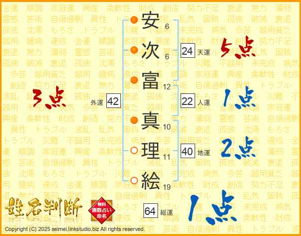 安(6画)次(6画)富(12画) 真(10画)理(11画)絵(19画)
