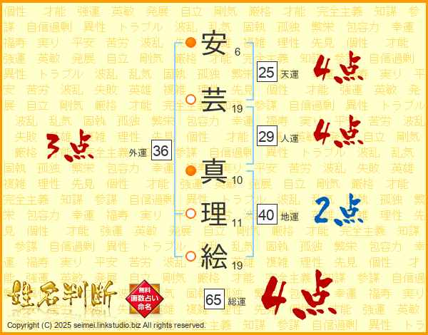 安(6画)芸(19画) 真(10画)理(11画)絵(19画)