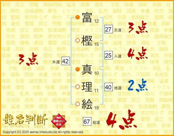 富(12画)樫(15画) 真(10画)理(11画)絵(19画)