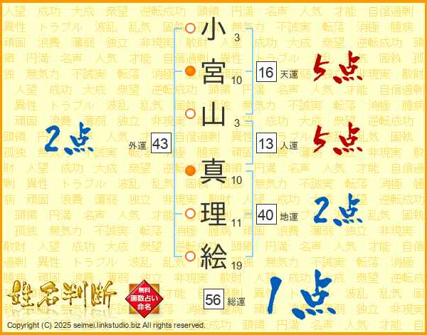 小(3画)宮(10画)山(3画) 真(10画)理(11画)絵(19画)