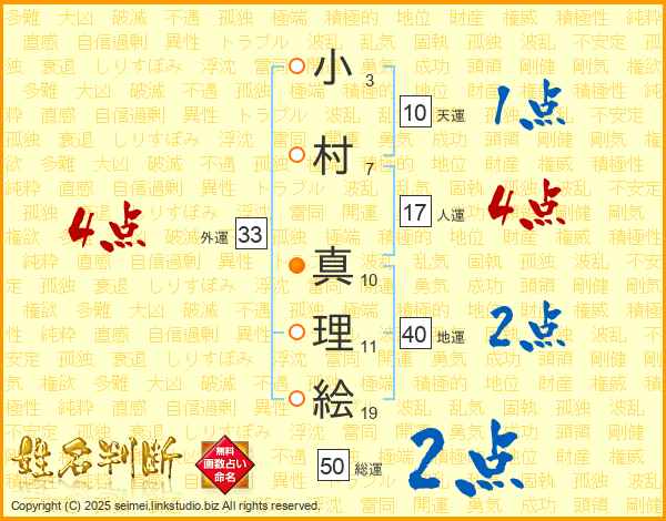 小(3画)村(7画) 真(10画)理(11画)絵(19画)