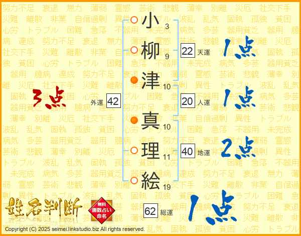 小(3画)柳(9画)津(10画) 真(10画)理(11画)絵(19画)