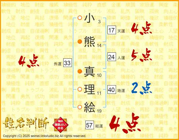 小(3画)熊(14画) 真(10画)理(11画)絵(19画)