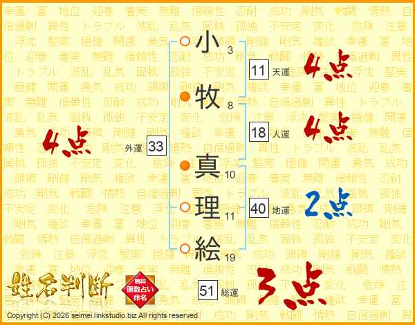 小(3画)牧(8画) 真(10画)理(11画)絵(19画)