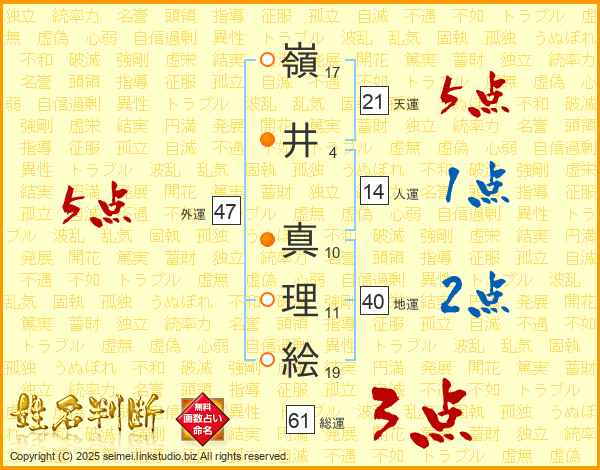 嶺(17画)井(4画) 真(10画)理(11画)絵(19画)