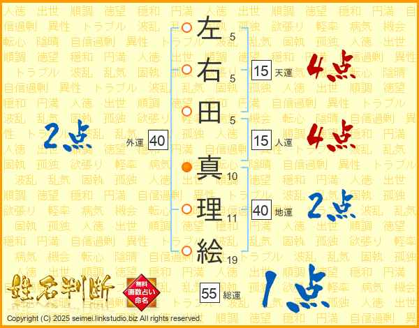 左(5画)右(5画)田(5画) 真(10画)理(11画)絵(19画)