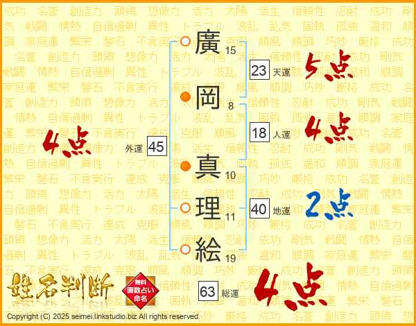 廣(15画)岡(8画) 真(10画)理(11画)絵(19画)
