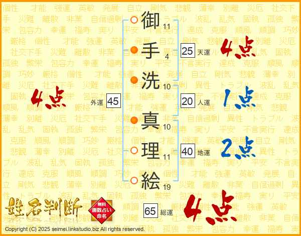 御手洗真理絵さんの総運は65画の4点!