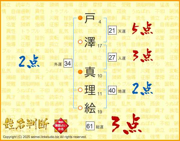 戸(4画)澤(17画) 真(10画)理(11画)絵(19画)