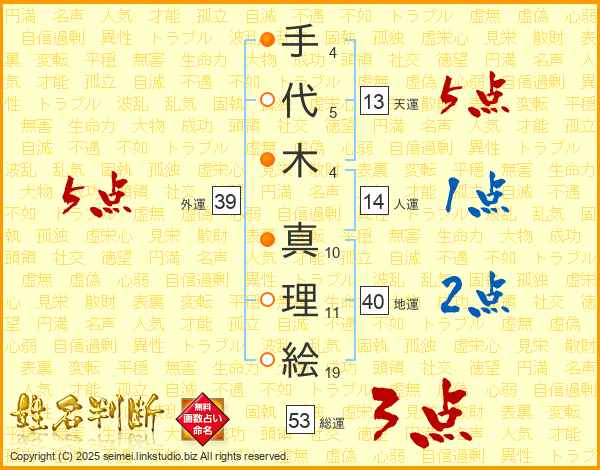 手(4画)代(5画)木(4画) 真(10画)理(11画)絵(19画)