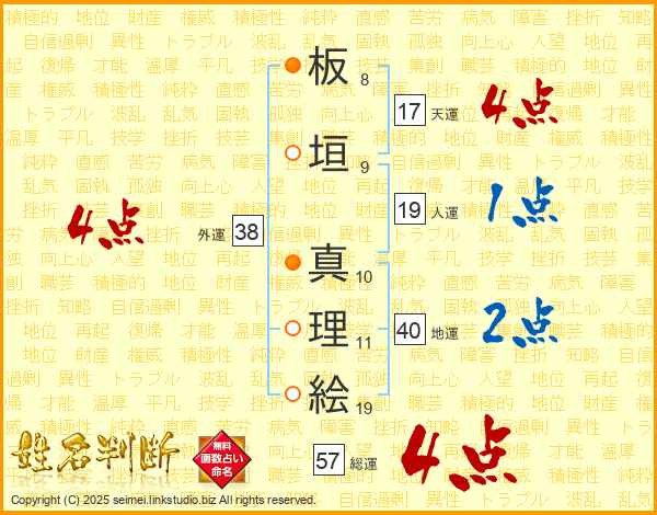板(8画)垣(9画) 真(10画)理(11画)絵(19画)