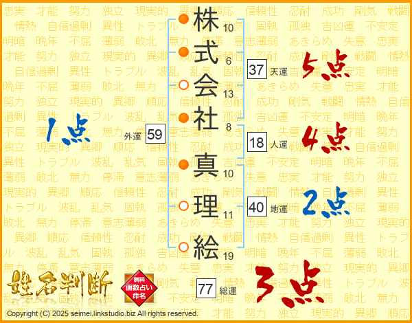 株(10画)式(6画)会(13画)社(8画) 真(10画)理(11画)絵(19画)
