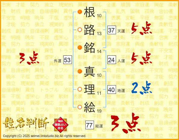 根(10画)路(13画)銘(14画) 真(10画)理(11画)絵(19画)