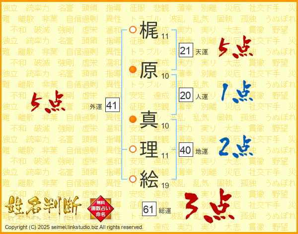 梶(11画)原(10画) 真(10画)理(11画)絵(19画)