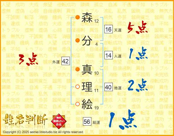 森(12画)分(4画) 真(10画)理(11画)絵(19画)