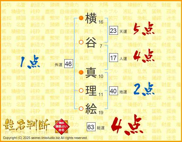 横(16画)谷(7画) 真(10画)理(11画)絵(19画)